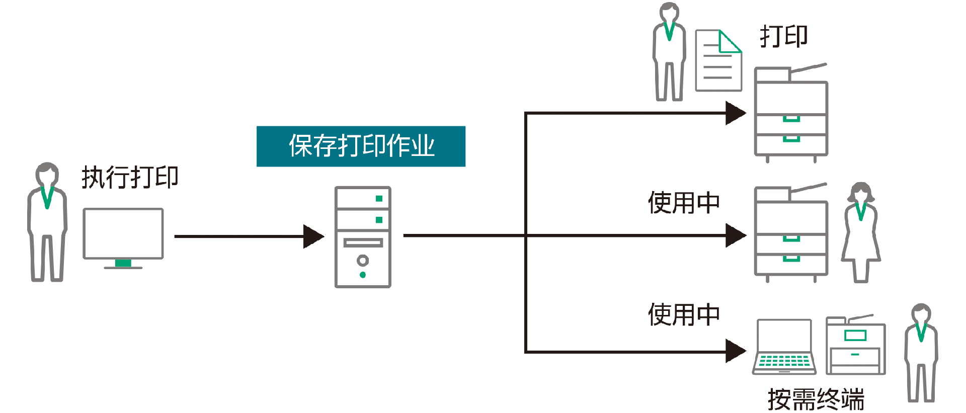可先將打印作業(yè)暫時保存在服務器上,然后在所選設備上進行用戶認證并使用按需打印*輸出所需文件。設置錯誤的作業(yè)也可在打印開始前快速刪除。