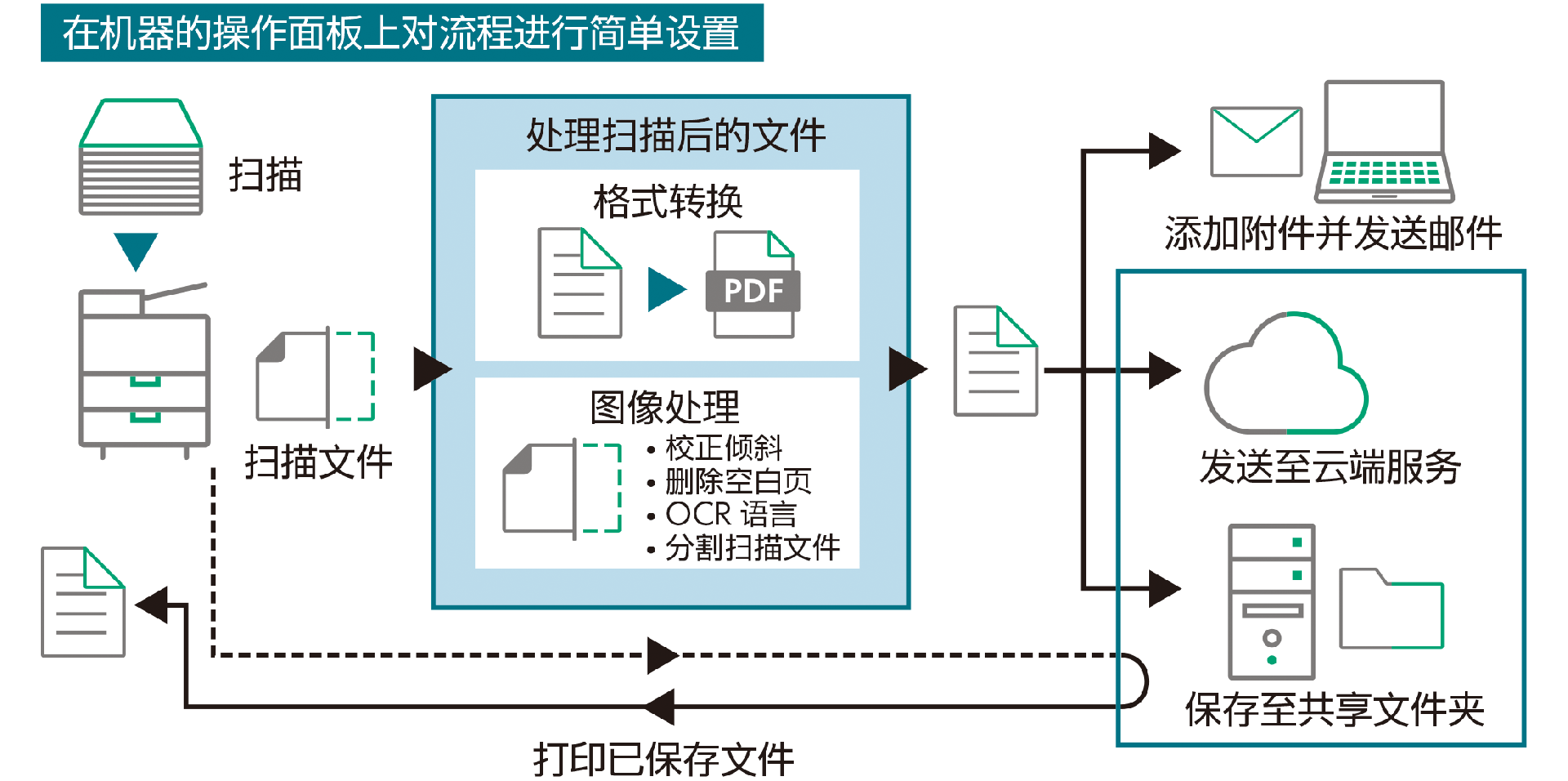 提供簡易流程功能來處理及發(fā)送掃描文件。可將掃描文件作為郵件的附件來發(fā)送,也可保存至網(wǎng)絡上的共享文件夾。