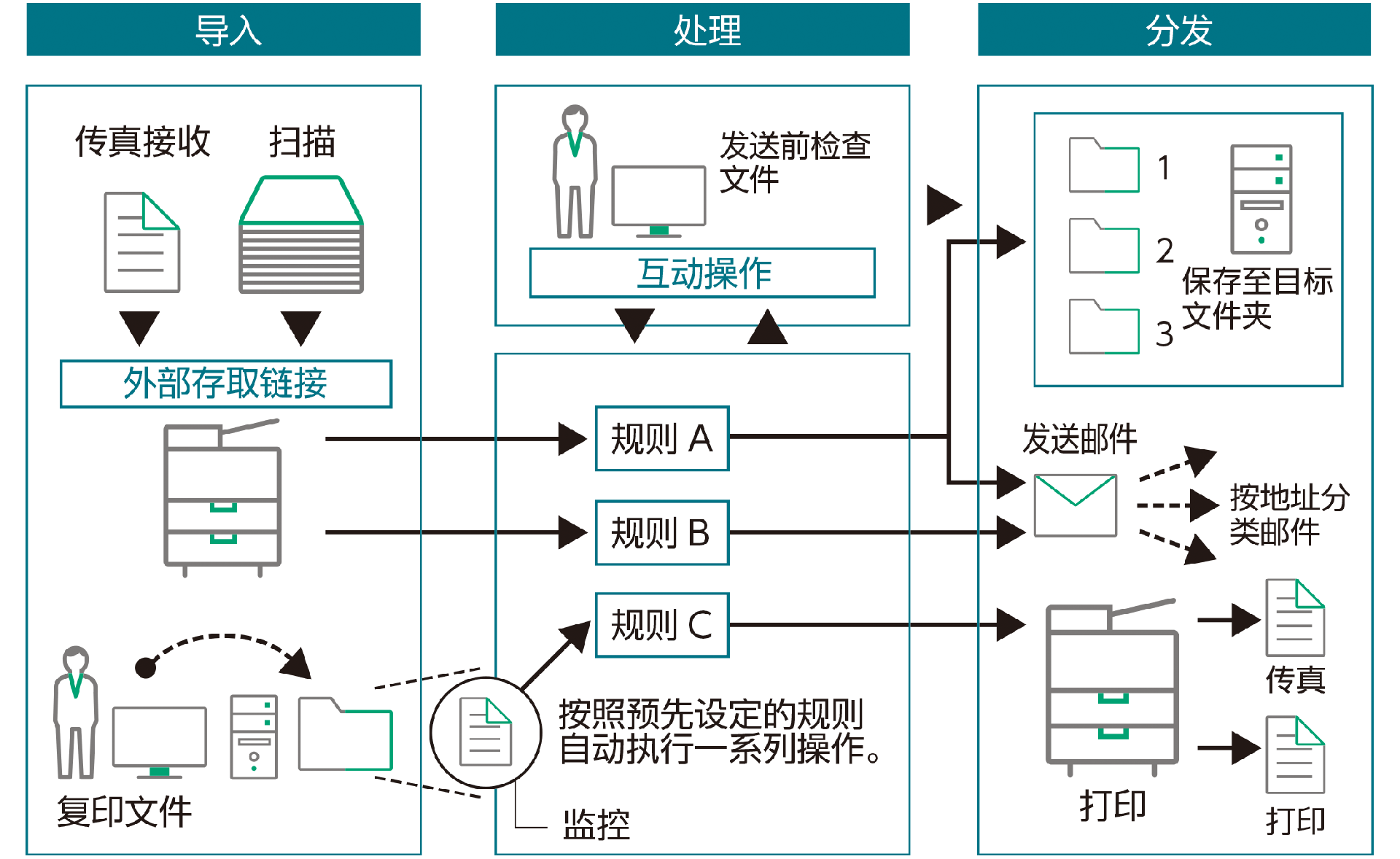 可預先將各種處理方式整合為“流程”并將其指定為規(guī)則。之后在接收傳真接收及執(zhí)行掃描操作時只需導入文件,即可自動執(zhí)行加工處理、發(fā)送、打印及保存等一系列操作。